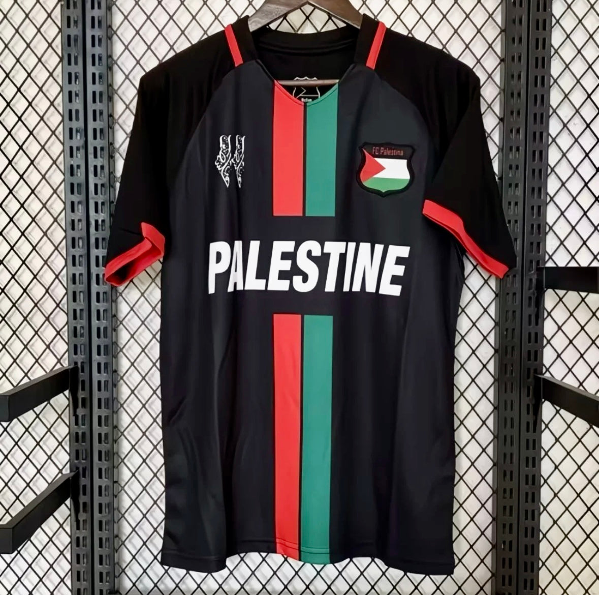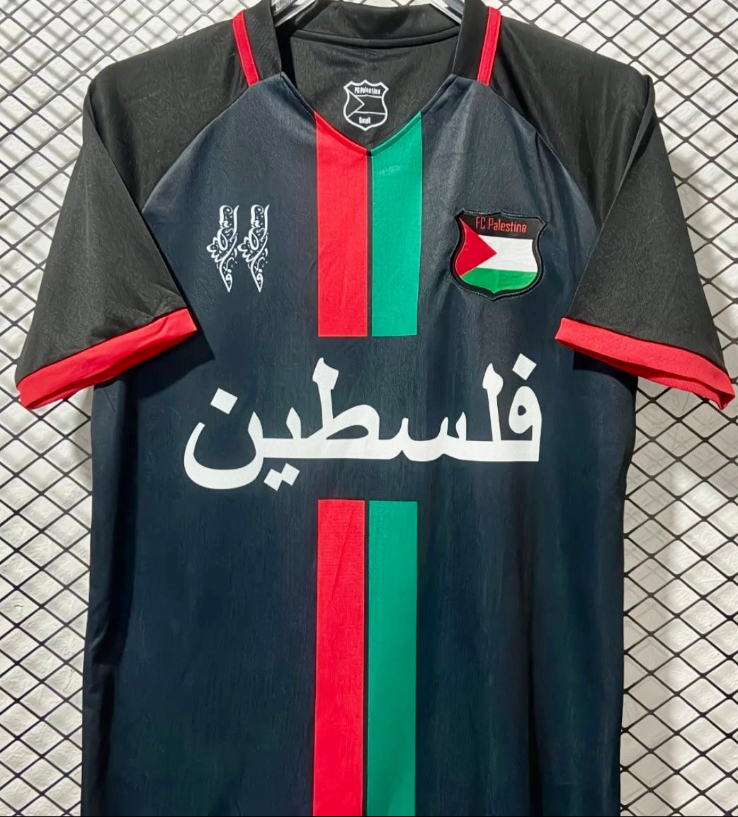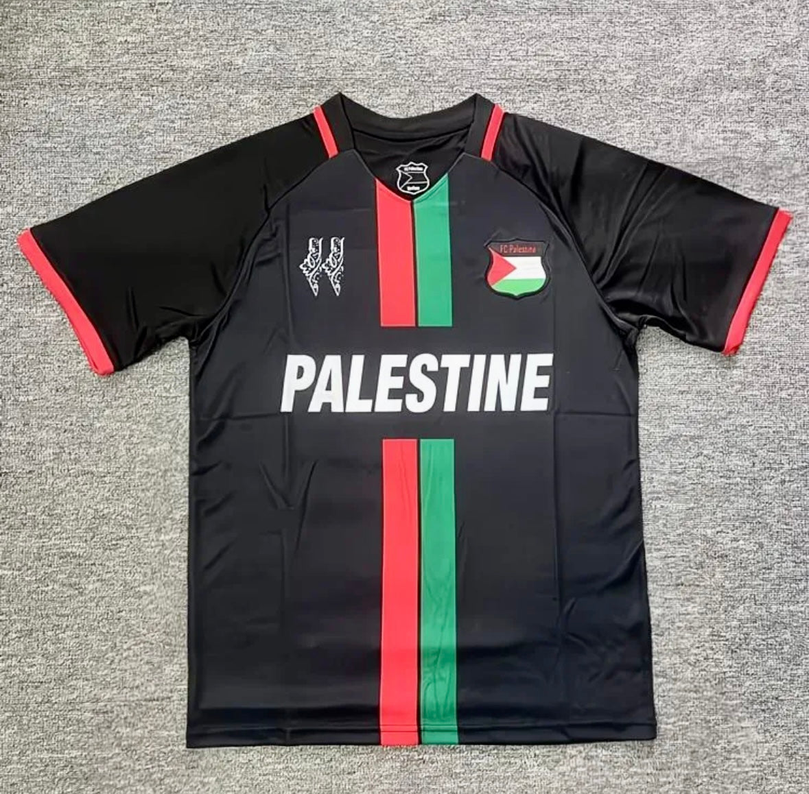 Trøjen fås i sort eller hvid med en stribe i palæstinensiske farver ned langs front og ryg. Teksten på fronten kan være “PALESTINE” på engelsk eller arabisk, og på ryggen er der en kontur af det historiske Palæstina. Trøjen er lavet af let og åndbart polyester, egnet til både sport og daglig brug.