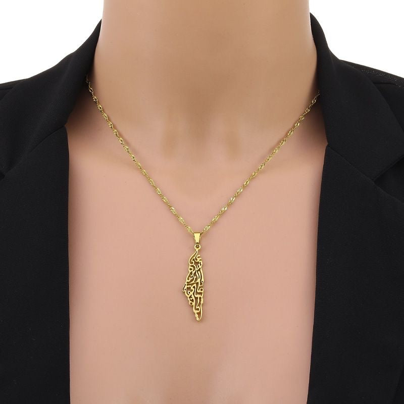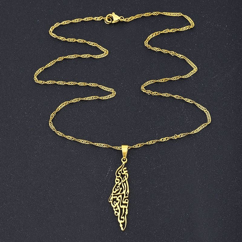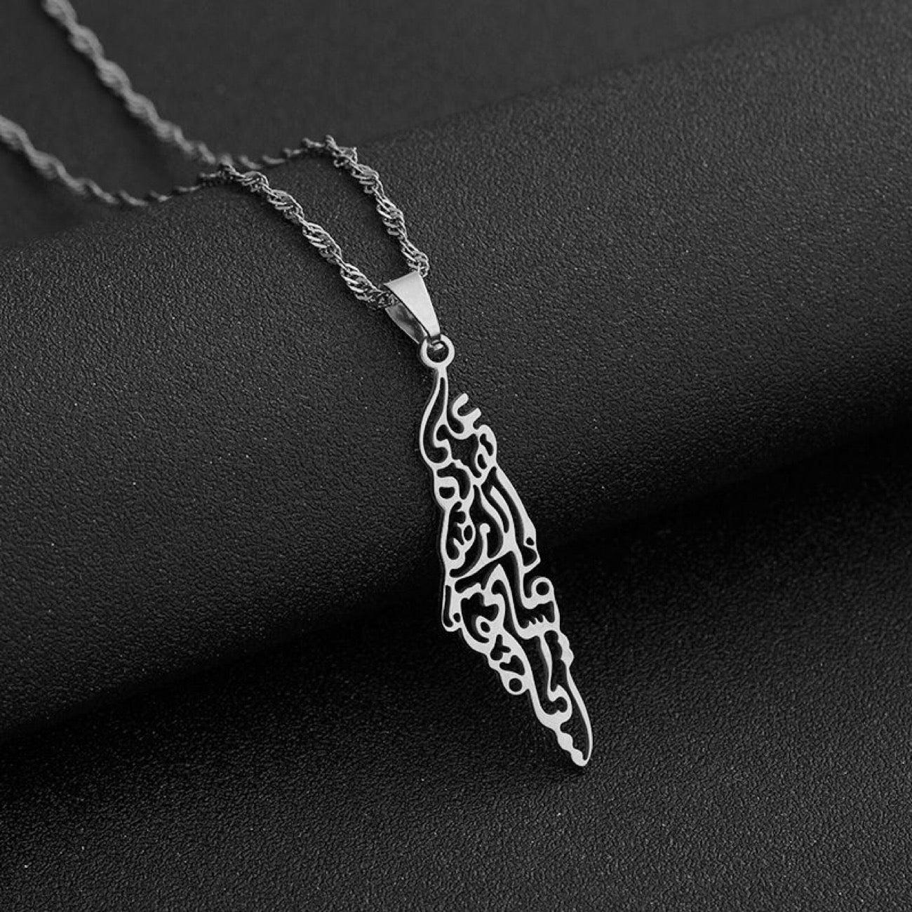 Giv dit outfit et personligt præg med denne fine halskæde, hvor vedhænget har form som kortet over Palæstina og har de ikoniske farver fra flaget. Halskæden er lavet i titanium stål, der holder sig flot og er nem at vedligeholde. Den leveres både i guld- og sølvfarvet, så du kan vælge det, der passer bedst til dig. Perfekt som gave eller hvis du bare vil vise lidt ekstra støtte.