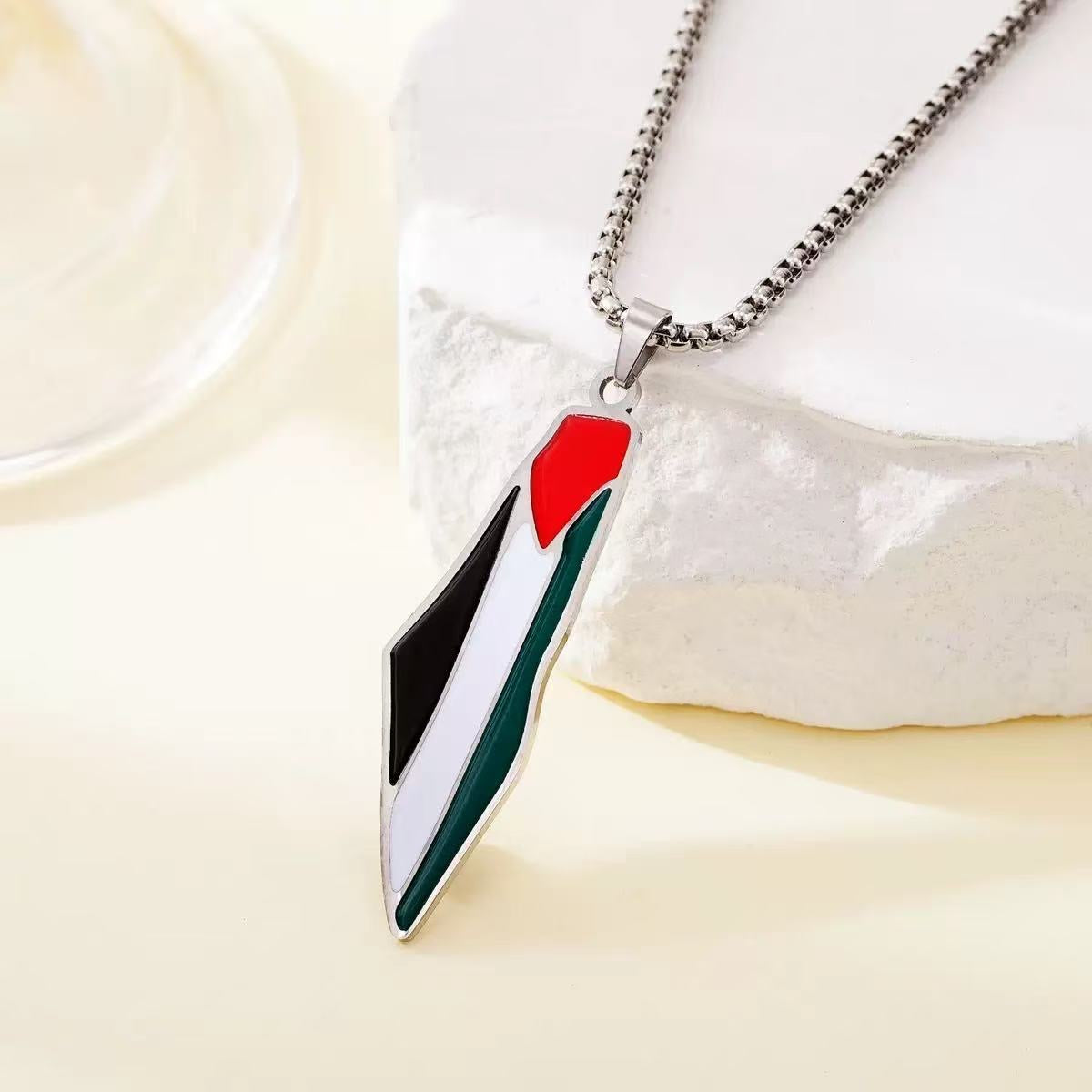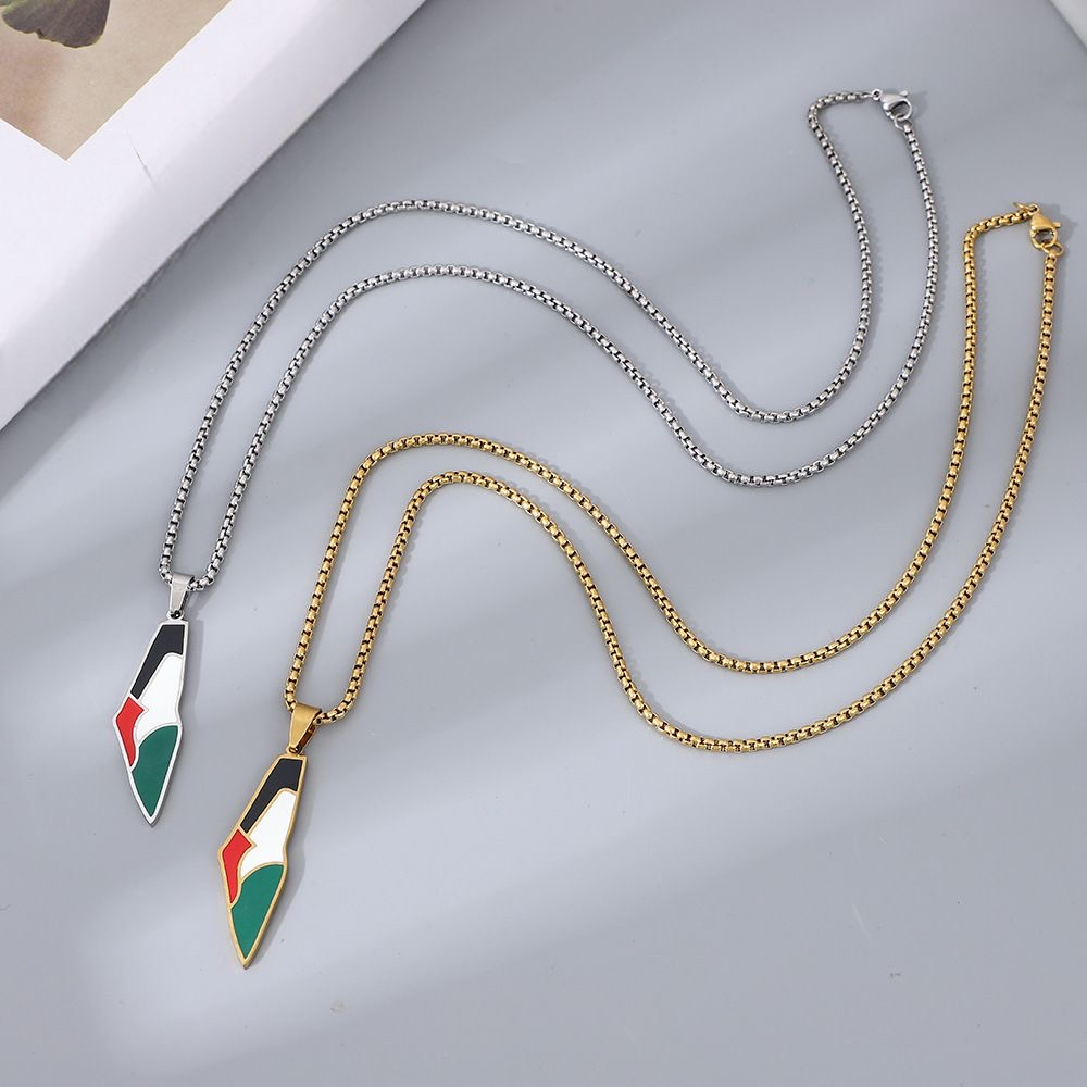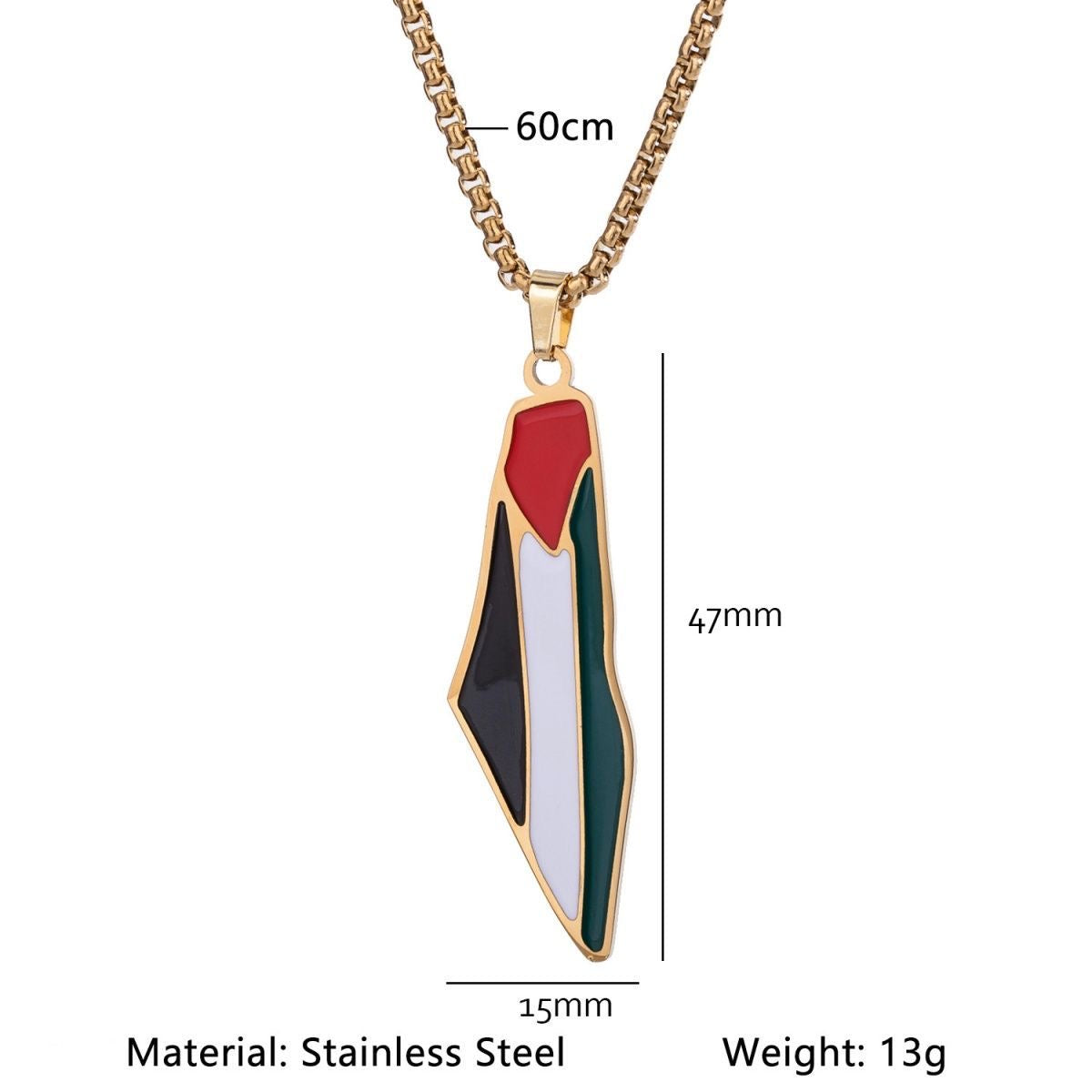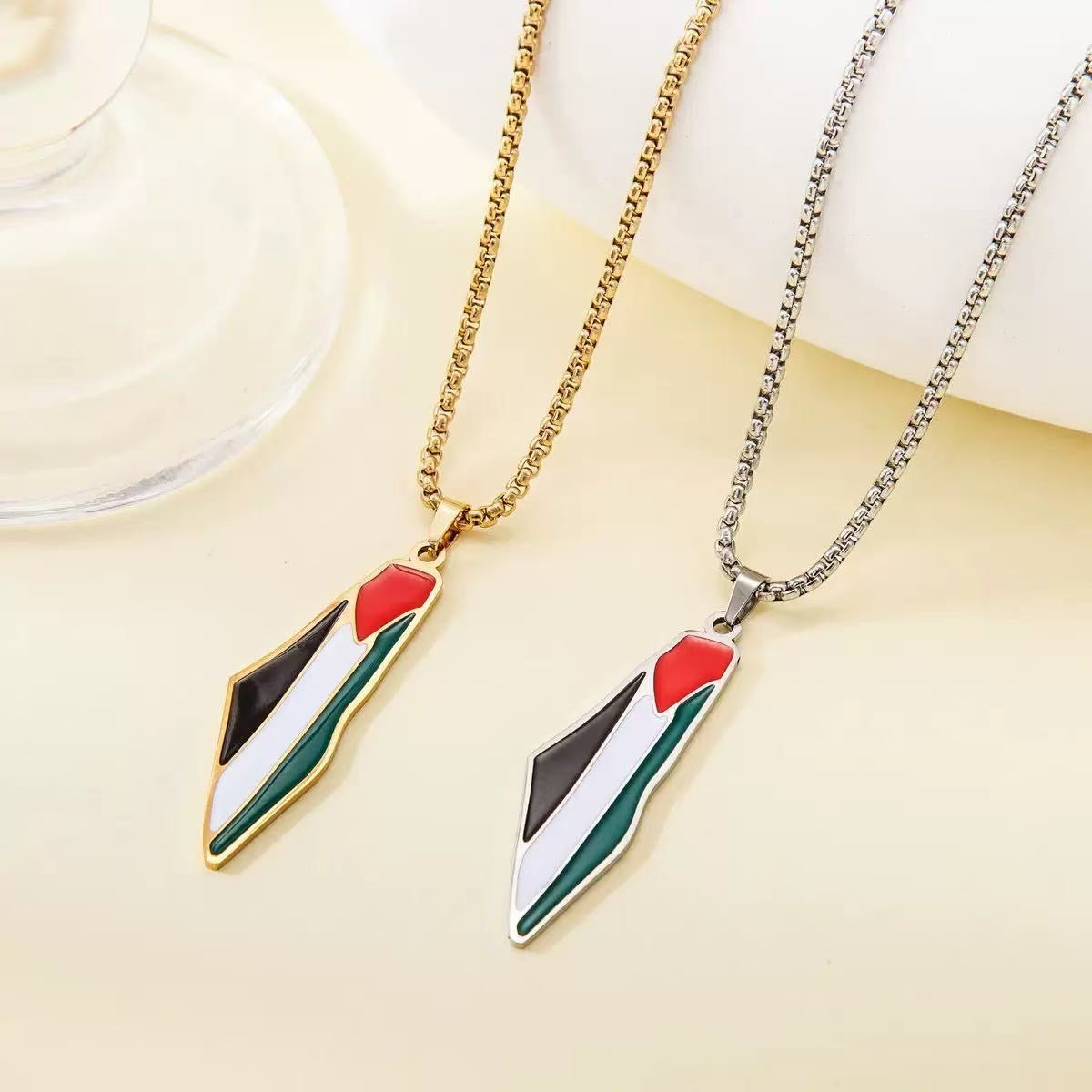 Halskæden har et vedhæng formet som kortet over Palæstina og fås i både guld og sølv. Der er to designvarianter, som begge har tydelige farver fra det palæstinensiske flag. Kæden er lavet af titanium stål, og vedhænget er lavet af alloy, hvilket giver holdbarhed og en elegant finish med kæde i moderne box-stil.