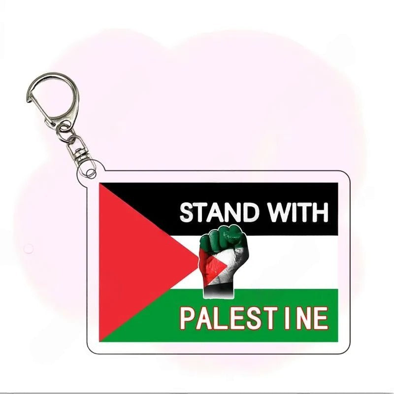 Nøgleringene fås enten som et sæt med fire forskellige designs eller som enkeltstående modeller. Motiverne inkluderer rektangulært, rundt, bølgende flag og en version med budskabet “Stand with Palestine”. De er lavet af robust materiale med metalring og kæde, hvilket gør dem holdbare til daglig brug.