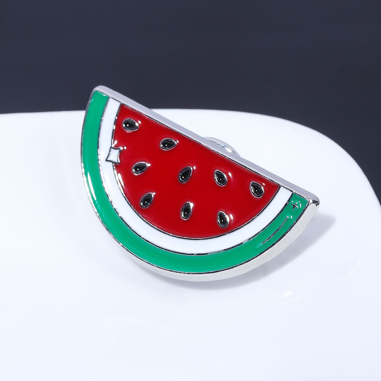 Pinsene er formet som vandmelonbåde i to forskellige varianter: en hel skive og en mindre bid af skiven. De er lavet af holdbar alloy med emaljefinish og klassisk pin-lukning, så de sidder godt fast. Pinsene kan bruges på jakker, tasker eller hatte som et dekorativt og legende element.